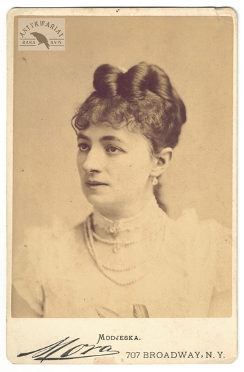 [MODRZEJEWSKA Helena - fotografia portretowa - ujęcie w formacie gabinetowym]. [l. 80. XIX w.]. Fotografia form. 14x10,1 cm na oryg. podkładzie form. 16,5x10,7 cm, autorstwa José Marii Mora w Nowym Jorku.