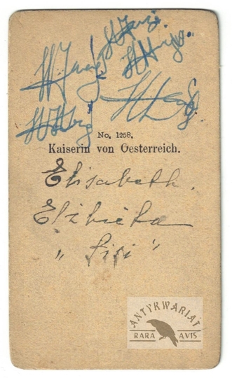 [SISI - cesarzowa Austrii i królowa Węgier Elżbieta Bawarska - fotografia portretowa - ujęcie w formacie cdv]. [2. poł. XIX w.]. Fotografia form. 8,3x5,1 cm na oryg. podkładzie form. 10,4x6,1 cm.