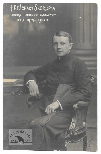 [SKORUPKA Ignacy ksiądz - fotografia portretowa]. [przed 14 VIII 1920/l. 30. XX w.]. Fotografia pocztówkowa form. 13,5x8,7 cm, fotografii autorstwa [Jana] Raczyńskiego z Warszawy.