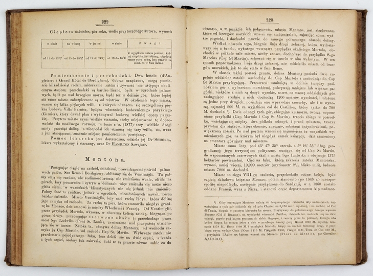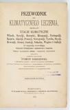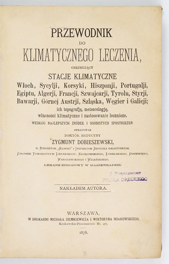 DOBIESZEWSKI Zygmunt – Przewodnik do klimatycznego leczenia, obejmujący stacje klimatyczne Włoch, Sycylji, Korsyki, Hiszpanji, Portugalji, Egiptu, Algerji, Francji, Szwajcarji, Tyrolu, Styrji, Bawarji, Górnej Austrji, Szląska, Węgier i Galicji; ich topografję, meteorologję, własności klimatyczne i zastosowanie lecznicze. Warszawa 1878. Nakł. autora. 8, s. [8], VIII, 565, [3]. opr. psk. z epoki.