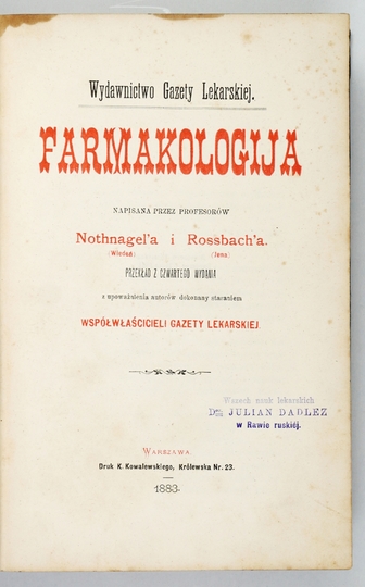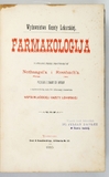 NOTHNAGEL [Hermann], ROSSBACH [Michael Joseph] – Farmakologija napisana przez profesorów ... Przekład [...] z upow. autorów dokonany staraniem współwłaścicieli Gazety Lekarskiej. Warszawa 1883. Wydawnictwo Gazety Lekarskiej. Druk K. Kowalewskiego. 8, s. [4], II, VI, 839, [1]. opr. ppł. z epoki.