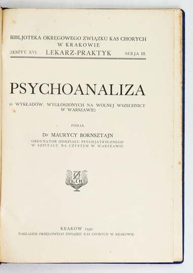 BORNSZTAJN Maurycy – Psychoanaliza. (6 wykładów, wygłoszonych na Wolnej Wszechnicy w Warszawie). Kraków 1930. Okręgowy Zw. Kas Chorych. 8, s. 63, [1]. opr. oryg. pł. zdob. Bibljot. Okręgowego Zw. Kas Chorych w Krakowie Lekarz-Praktyk, zesz. 16, seria 3.