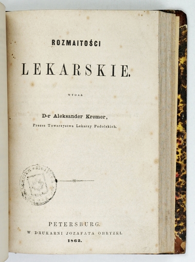 [oraz] KREMER Aleksander – Rozmaitości lekarskie. Wydał ... Petersburg 1862. Druk. J. Ohryzki. 16d, s. 139, [2]. razem opr. psk. z epoki.