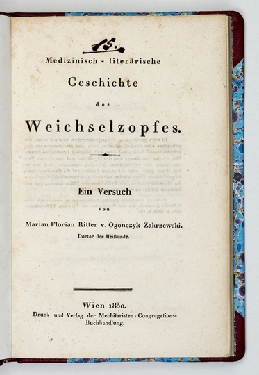 ZAKRZEWSKI Marian Florian Ritter v. Ogończyk – Medizinisch-literärische Geschichte des Weichselzopfes. Ein Versuch von ... Wien 1830. Druck und Verlag der Mechitaristen-Congregations-Buchhandlung. 8, s. VIII, 150, [2]. opr. wsp. psk.