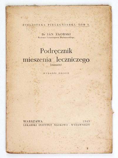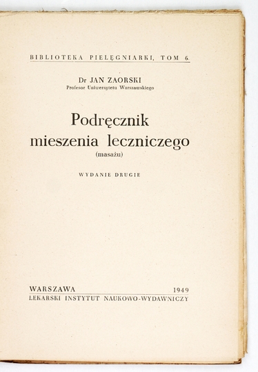 ZAORSKI Jan – Podręcznik mieszenia leczniczego (masażu). Wyd. II. Warszawa 1949. Lekarski Instytut Naukowo-Wydawniczy. 8, s. 101. brosz. Biblioteka Pielęgniarki, t. 6.
