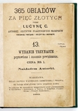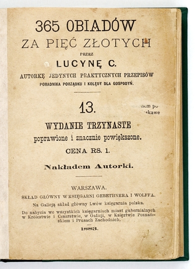 [ĆWIERCZAKIEWICZOWA] Lucyna – 365 obiadów za pięć złotych. Przez Lucynę C. [krypt.], autorkę Jedynych praktycznych przepisów [...]. Wyd. XII poprawione i znacznie powiększone. Warszawa 1883. Nakł. autorki. 16d, s. 414, XVII. opr. wsp. ppł.