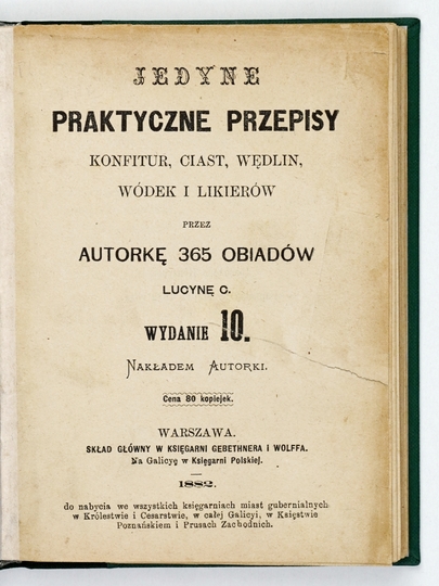 [ĆWIERCZAKIEWICZOWA Lucyna] – Jedyne praktyczne przepisy konfitur, ciast, wędlin, wódek i likierów przez Autorkę 365 obiadów Lucynę C. [krypt.]. Wyd. X. Warszawa 1882. Nakł. autorki. 16d, s. X, 262. opr. wsp. ppł.