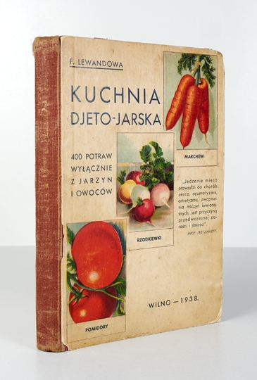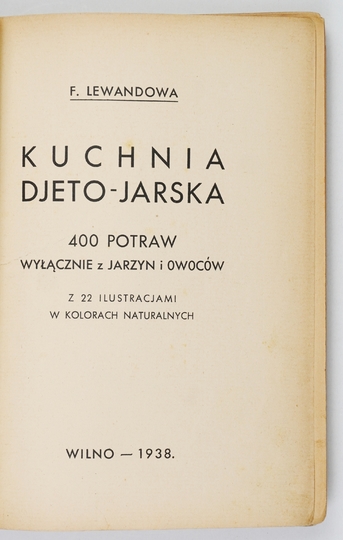 LEWANDOWA F[anni] – Kuchnia djeto-jarska. 400 potraw wyłącznie z jarzyn i owoców. Z 22 ilustracjami w kolorach naturalnych. Wilno 1938. Druk. J. Zawadzkiego. 8, s. VIII, 196, tabl. 3. opr. oryg. ppł.