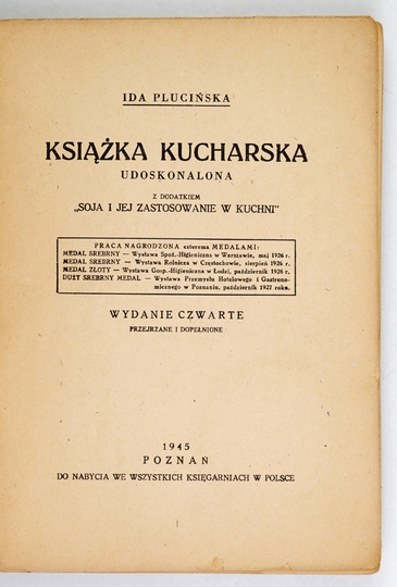 PLUCIŃSKA Ida – Książka kucharska udoskonalona z dodatkiem "Soja i jej zastosowanie w kuchni" [...]. Wyd. IV przejrzane i dopełnione. Warszawa 1945. Druk. św. Wojciecha. 8, s. XV, [1], 271, [1]. brosz.