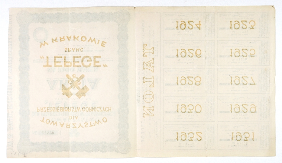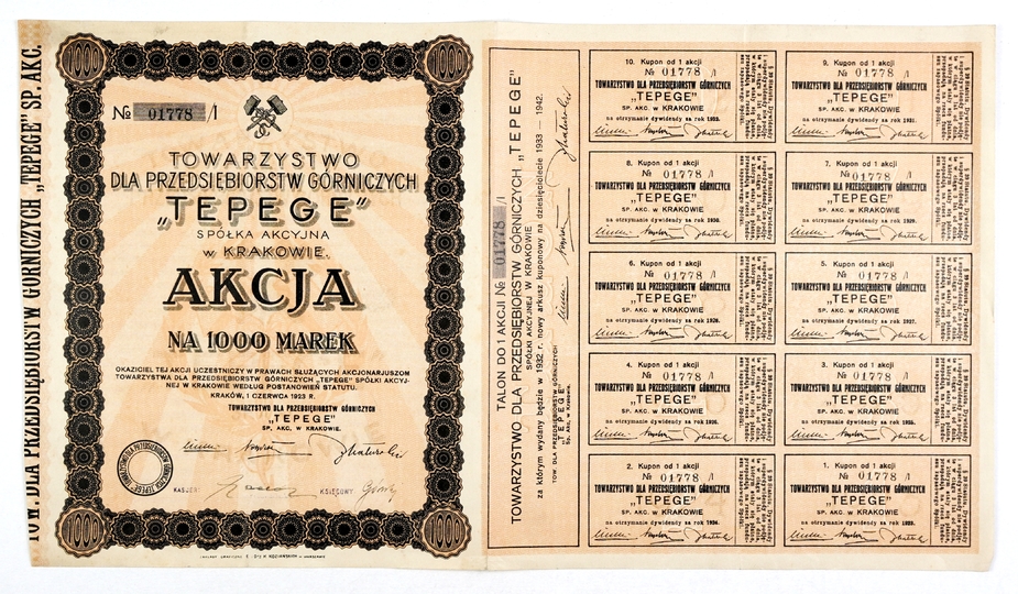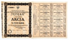 TEPEGE, Towarzystwo dla Przedsiębiorstw Górniczych, Spółka Akcyjna w Krakowie. Akcja na 1000 marek.
