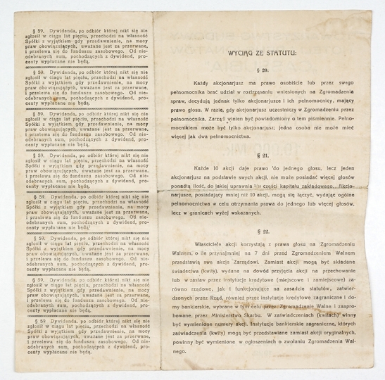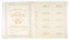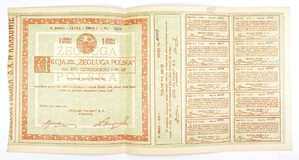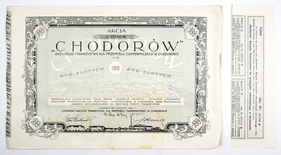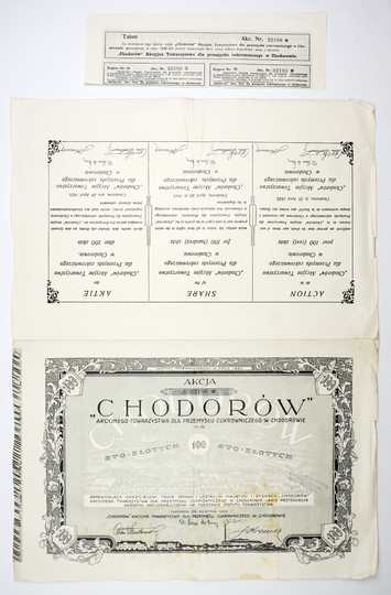 CHODORÓW, Akcja ... Akcyjnego Towarzystwa dla Przemysłu Cukrowniczego w Chodorowie na sto złotych 100 zapewniająca okazicielowi takie prawa i udział w majątku i zyskach [...] jakie przysługują każdemu akcjonarjuszowi [...].