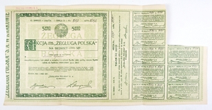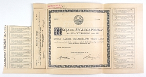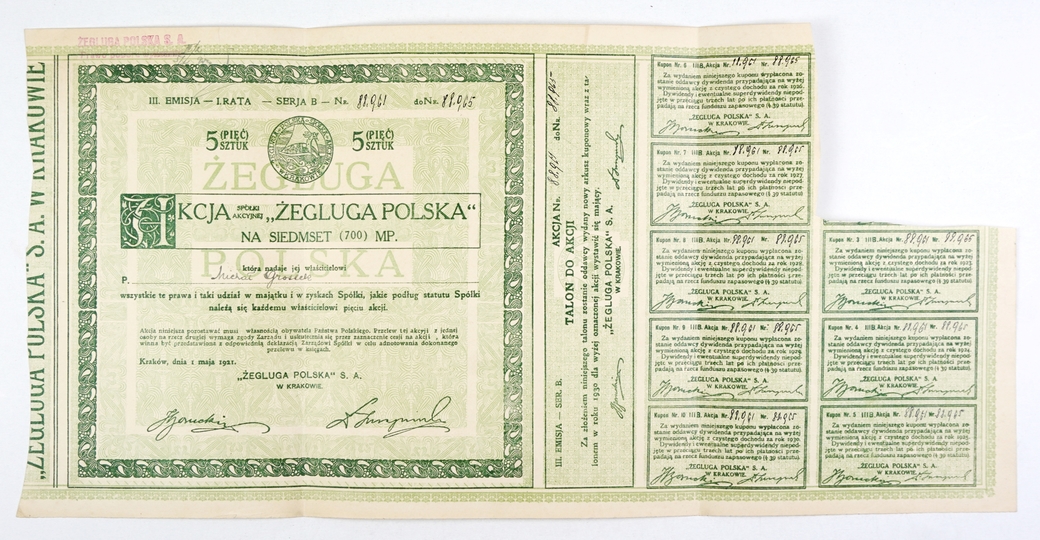 ŻEGLUGA Polska, Spółka Akcyjna. 5 (pięć) sztuk. Akcja ... na siedmset (700) MP., która nadaje jej właścicielowi [...] wszystkie te prawa [...] jakie [...] należą się każdemu właścicielowi pięciu akcji.