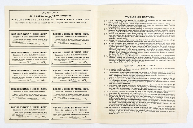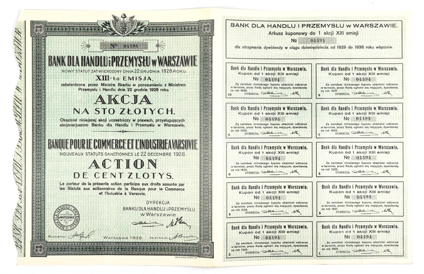 BANK dla Handlu i Przemysłu w Warszawie. XIII-a Emisja [...] Akcja na 100 złotych.