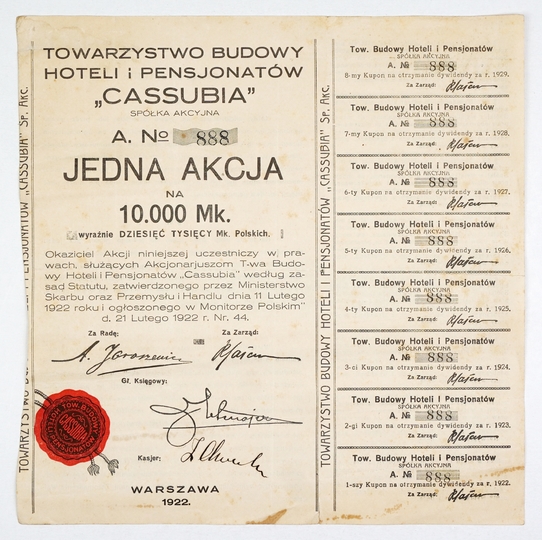 CASSUBIA, Towarzystwo Budowy Hoteli i Pensjonatów. Jedna akcja na 10.000 Mk, wyraźnie dziesięć tysięcy Mk. Polskich.
