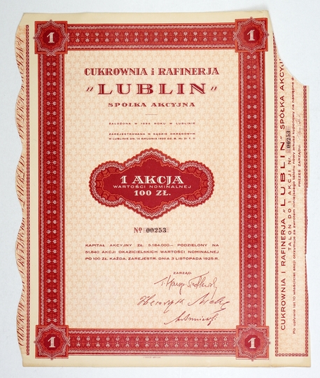 "LUBLIN", Cukrownia i Rafinerja, Spółka Akcyjna. 1 akcja wartości nominalnej 100 zł. każda.