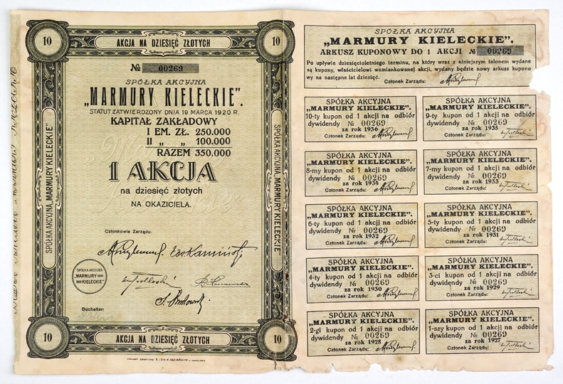 MARMURY Kieleckie, Spółka Akcyjna. 1 akcja na 10 złotych na okaziciela.