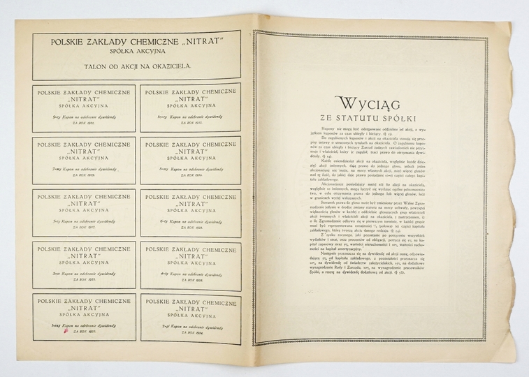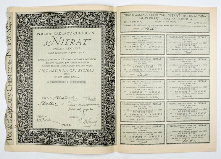 NITRAT, Zakłady Chemiczne, Spółka Akcyjna [...]. Pięć akcji na okaziciela I emisji po 500 marek każda.