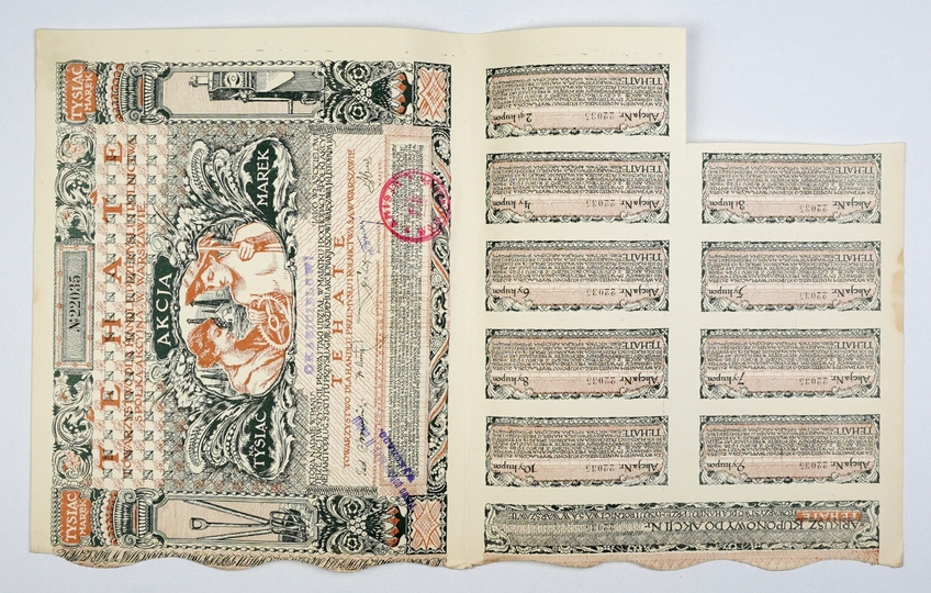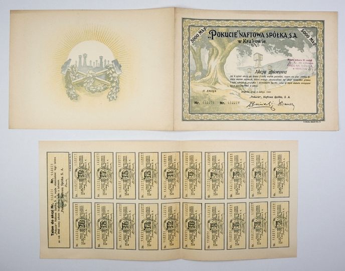 POKUCIE. Naftowa Spółka S. A. w Krakowie. Akcja zbiorowa na 5 sztuk akcyj po tysiąc (1000) marek polskich, razem na pięć (5000) tysięcy marek polskich [...]. II. emisja.