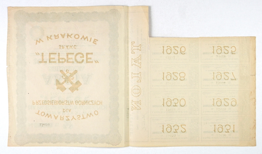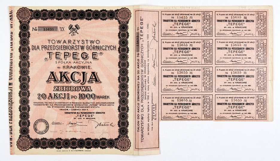 TEPEGE, Towarzystwo dla Przedsiębiorstw Górniczych, Spółka Akcyjna w Krakowie. Akcja zbiorowa, 20 akcji po 1000 marek.