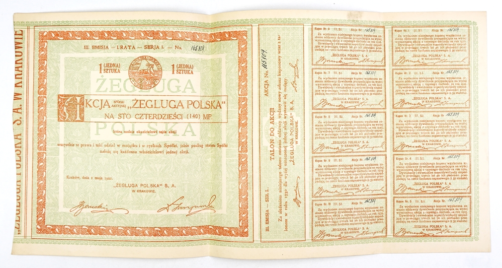 ŻEGLUGA Polska, Spółka Akcyjna. 1 (jedna) sztuka. Akcja ... na sto czterdzieści (140) MP., która nadaje okazicielowi tejże akcji [...] wszystkie te prawa [...] jakie [...] należą się każdemu właścicielowi jednej akcji.