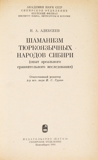 ALEKSEEV N. A. – Šamanizm tjurkojazyčnych narodov Sibiri (opyt arealnogo spravitelnogo issledovanija). Novosibirsk 1984. Izdat. "Nauka". 8, s. 232, [1], tabl. 12. opr. oryg. pł.