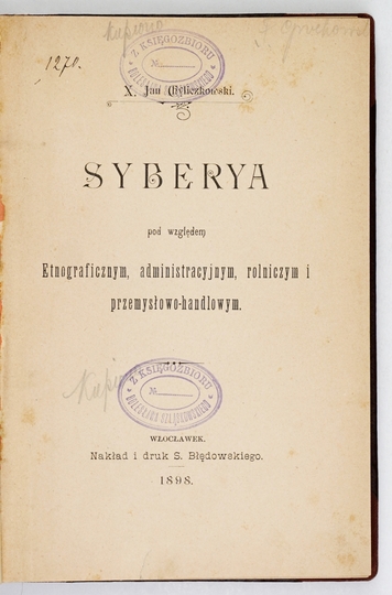 CHYLICZKOWSKI Jan – Syberya pod względem etnograficznym, administracyjnym, rolniczym i przemysłowo-handlowym. Włocławek 1898. Nakł. S. Błędowskiego. 8, s. XIV, 309, [1], VIII. opr. wsp. ppł.