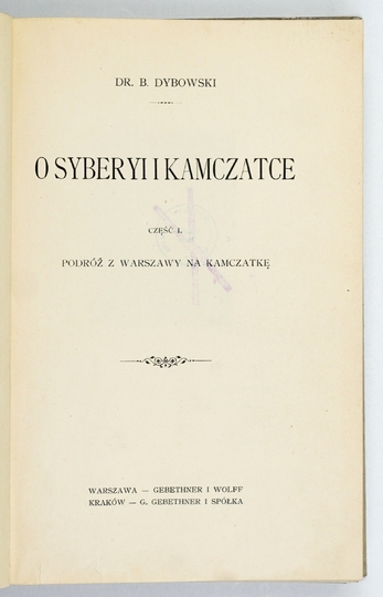DYBOWSKI B[enedykt Nałęcz] – O Syberyi i Kamczatce. Cz. 1: Podróż z Warszawy na Kamczatkę. Warszawa [1912]. Gebethner i Wolff. 8, s. [2], XX, 562, [1], tabl. 13. opr. wsp. pł.