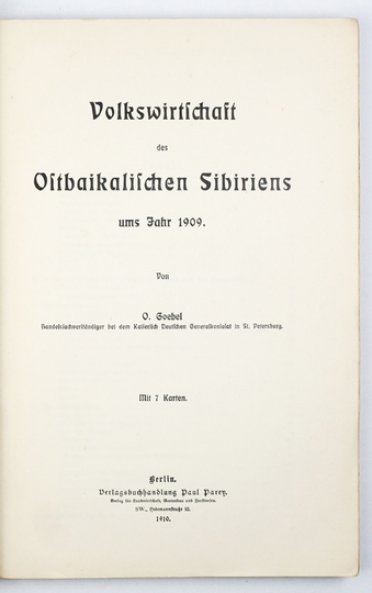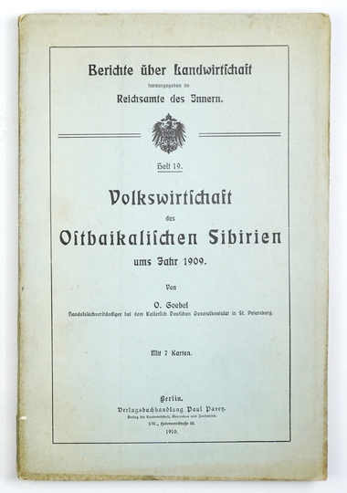 GOEBEL O. – Volkswirtschaft des Ostbaikalischen Sibirien ums Jahr 1909. Mit 7 Karten. Berlin 1910. Verlagsbuchhandlung P. Parey. 4, s. VI, 206, map rozkł. 7. brosz. Berichte über Landwirtschaft, Heft 19.