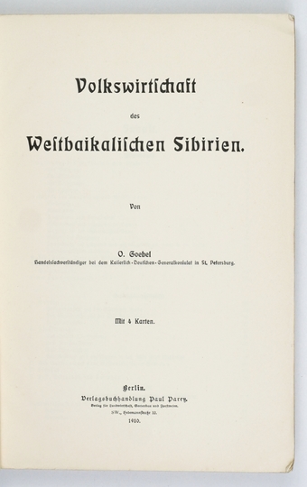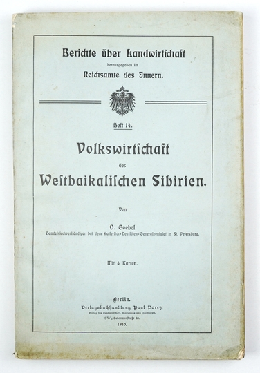 GOEBEL O. – Volkswirtschaft des Westbaikalischen Sibirien. Mit 4 Karten. Berlin 1910. Verlagsbuchhandlung P. Parey. 4, s. X, 326, mapy rozkł. 4. brosz. Berichte über Landwirtschaft, Heft 14.