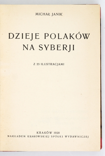 JANIK Michał – Dzieje Polaków na Syberji. Z 23 ilustracjami. Kraków 1928. Krakowska Spółka Wyd. 16d, s. VIII, 472, tabl. 13. opr. nieco późn. ppł. [Z Historji i Literatury].