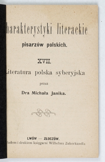 JANIK Michał – Literatura polska syberyjska. Lwów-Złoczów [1907]. Księg. W. Zukerkandla. 16, s. 83. brosz. wt. Charakterystyki Literackie Pisarzów Polskich, [nr] 17. [Biblioteka Powszechna, nr 622-623].