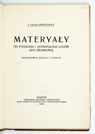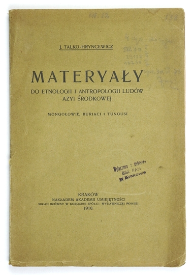 TALKO-HRYNCEWICZ J[ulian] – Materyały do etnologii i antropologii ludów Azyi Środkowej. Mongołowie, Buriaci i Tungusi. Kraków 1910. AU. 8, s. 96. brosz.