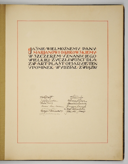 ALBUM sporządzony w 1929 w uznaniu dla Mariana Dąbrowskiego, twórcy koncernu IKC, przez członków krakowskiego oddziału Związku Polskich Artystów Plastyków, zawierający 9 oryginalnych prac na papierze.