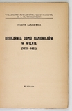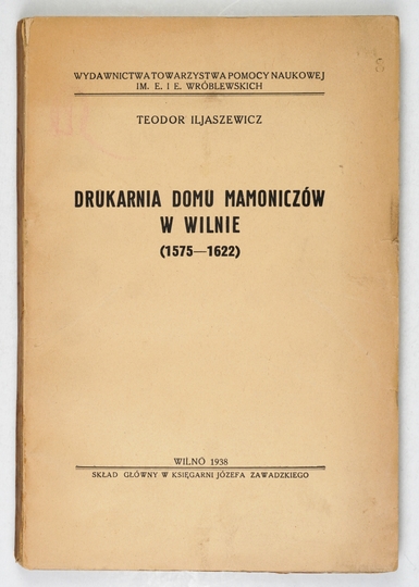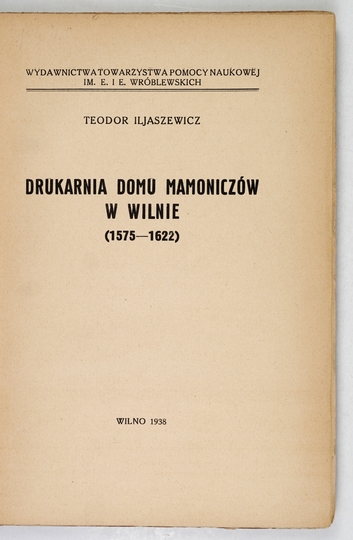 ILJASZEWICZ Teodor – Drukarnia domu Mamoniczów w Wilnie (1575-1622). Wilno 1938. Tow. Pomocy Naukowej im. E. i E. Wróblewskich. 8, s. 155, [4], tabl. 7. brosz.