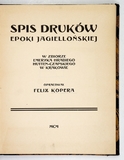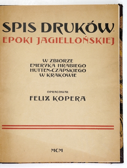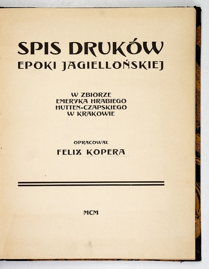 KOPERA Felix – Spis druków epoki jagiellońskiej w zbiorze Emeryka hr. Hutten-Czapskiego w Krakowie. Kraków 1900. Nakł. hr. Emerykowej Hutten-Czapskiej. 4, s. [10], szp. 232, s. [7]. opr. wsp. psk. z zach. okł. brosz.