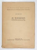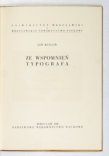 KUGLIN Jan – Ze wspomnień typografa. Wrocław 1958. PWN. 8, s. 59, [1], tabl. 4. brosz. Odb. z "Roczników Bibliotecznych".