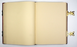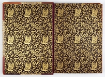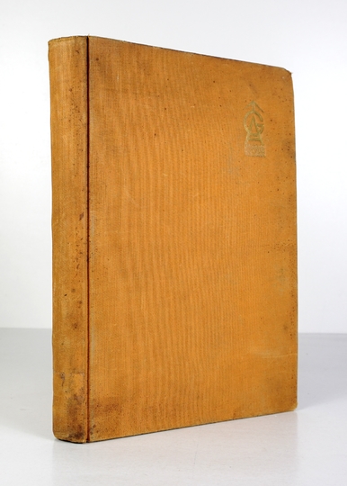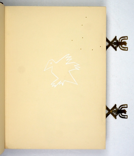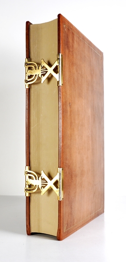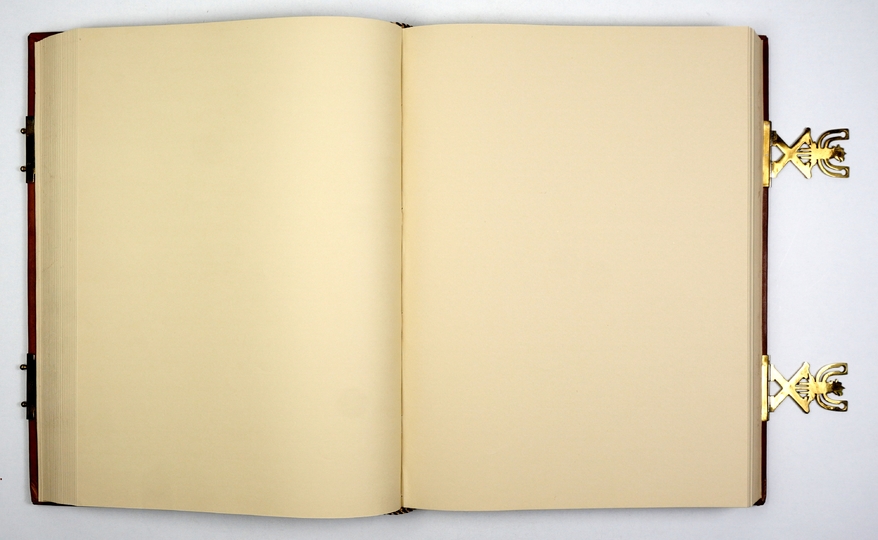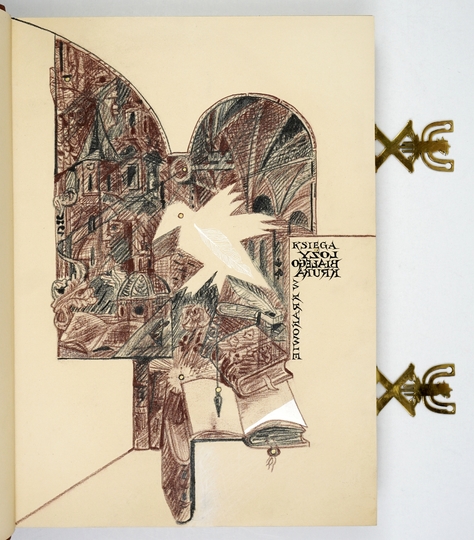 [LOŻA Białego Kruka, księga pamiątkowa]. Luksusowa księga zapewne z lat 70 lub 80 XX w., z odręcznie rysowaną kompozycją na dwóch pierwszych kartach, z kaligrafowanym tytułem: "Księga Loży Białego Kruka w Krakowie".
