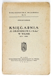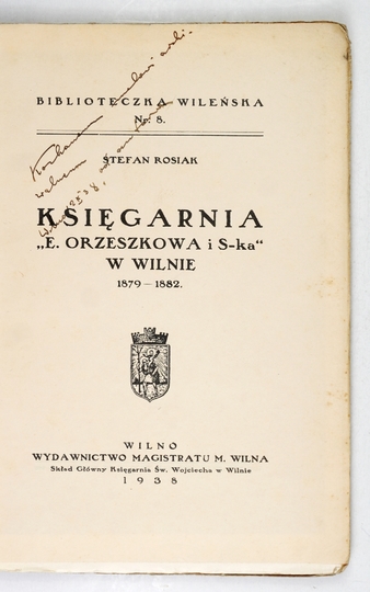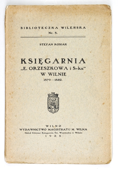 ROSIAK Stefan – Księgarnia "E. Orzeszkowa i S-ka" w Wilnie 1879-1882. Wilno 1938. Wyd. Magistratu m. Wilna. 8, s. 121, [2], tabl. 5. brosz. Biblioteczka Wileńska, nr 8.