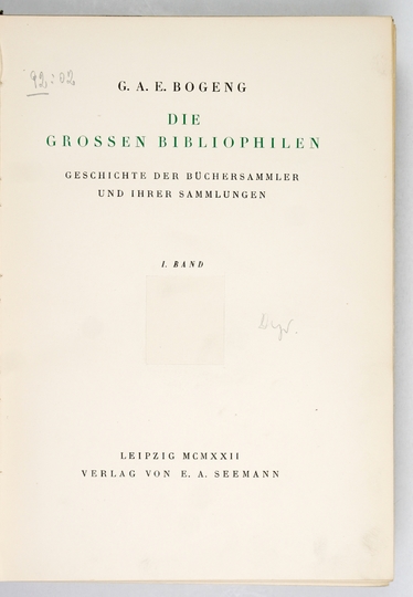 BOGENG G[ustav] A[dolf] E[rich] – Die grossen Bibliophilen. Geschichte der Büchersammler und ihrer Sammlungen. Bd. 1-3. Leipzig 1922. Verlag von E. A. Seemann. 4, s. [8], 512, [1]; XVI, [2], tabl. 123; [8], 248. opr. oryg. pł.