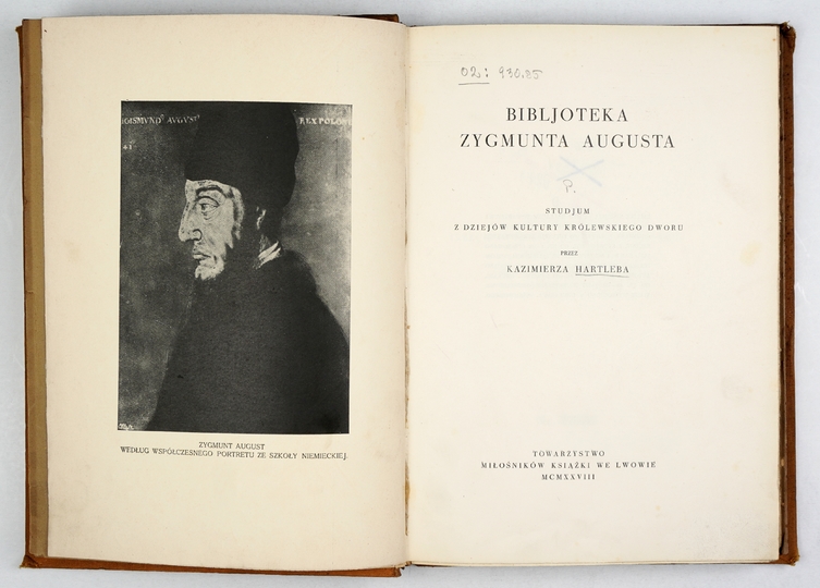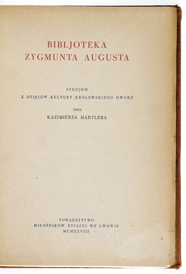 HARTLEB Kazimierz – Bibljoteka Zygmunta Augusta. Studjum z dziejów kultury królewskiego dworu. Lwów 1928. Tow. Miłośników Książki. 8, s. [6], 177, [4], tabl. 12. opr. pł. z epoki z zach. okł. brosz.