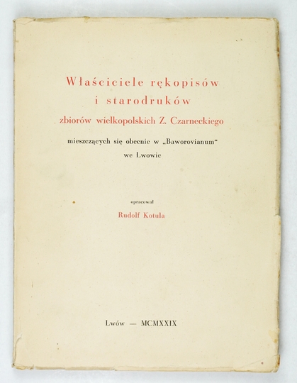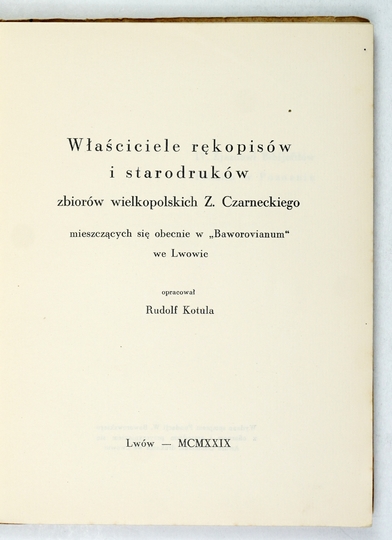 KOTULA Rudolf – Właściciele rękopisów i starodruków zbiorów wielkopolskich Z. Czarneckiego mieszczących się obecnie w "Baworovianum" we Lwowie. Oprac. ... Lwów 1929. Nakł. Fundacji W. Baworowskiego. 8, s. XV, [1], 139, [1], tabl. 21. brosz.