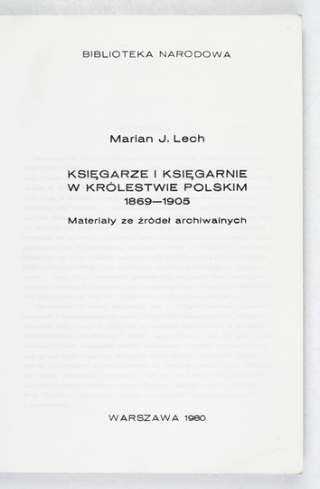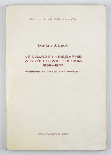 LECH Marian J. – Księgarze i księgarnie w Królestwie Polskim 1869-1905. Materiały ze źródeł archiwalnych. Warszawa 1980. Bibliot. Narodowa. 8, s. 286, [2]. brosz.