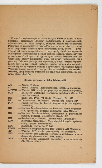 LERSKA Hanna – Druki Polski Podziemnej i wydawnictwa powstańcze. [Paryż, XI 1949]. [Instytut Literacki]. 8, s. 23. brosz. [Odb. z "Kultury"].