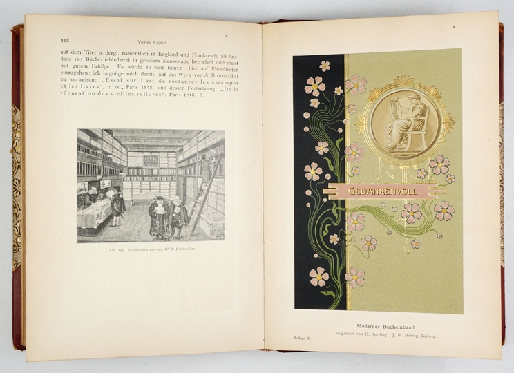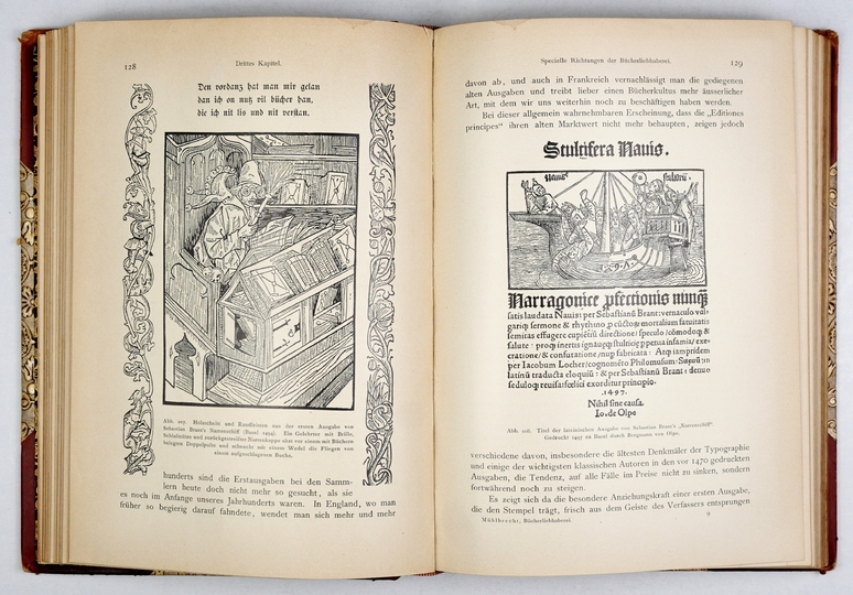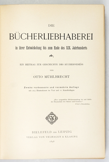 MÜHLBRECHT Otto – Die Bücherliebhaberei in ihrer Entwickelung bis zum Ende des XIX. Jahrhunderts. Ein Beitrag zur Geschichte der Bücherwesens. Zweite verbesserte und vermehrte Aufl. mit 213 Illustrationen im Text und 11 Kunstbeilagen. Bielefeld-Leipzig 1898. Velhagen & Klasing. 8, s. XII, 335, tabl. 11. opr. oryg. psk. zdob.