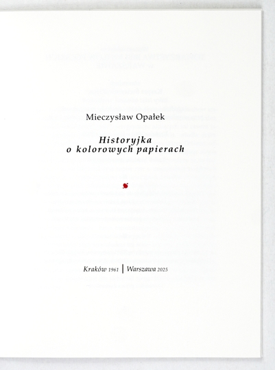 OPAŁEK Mieczysław – Historyjka o kolorowych papierach. Kraków 1961 - Warszawa 2025. Wydano nakładem Towarzystwa Bibliofilów Polskich w Warszawie staraniem Kaspra Świerzowskiego. 16d, s. 18, [5]. brosz.