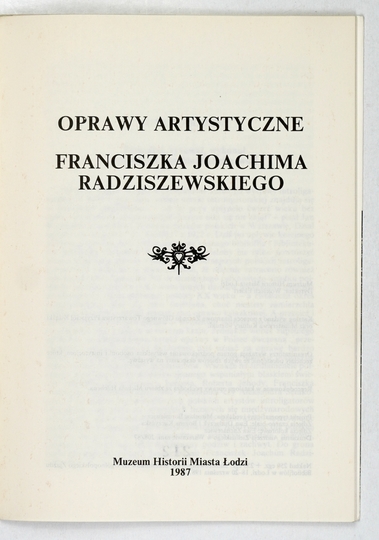 [RADZISZEWSKI Franciszek J.]. Oprawy artystyczne Franciszka Joachima Radziszewskiego. Łódź 1987. Muz. Historii Miasta Łodzi. 8, s. [36], tabl. barwne 2. brosz., obw.