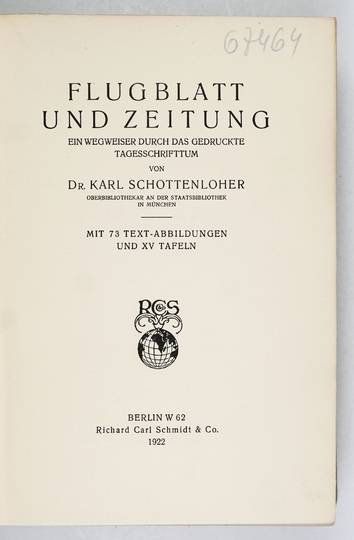 SCHOTTENLOHER Karl – Flugblatt und Zeitung. Ein Wegweiser durch das gedruckte Tagesschrifttum. Mit 73 Text-Abbildungen und XV Tafeln. Berlin 1922. R. C. Schmidt & Co. 8, s. 555, XXIX, tabl. 15. opr. oryg. ppł. Bibliothek für Kunst- und Antiquitäten-Sammler, Bd. 21.