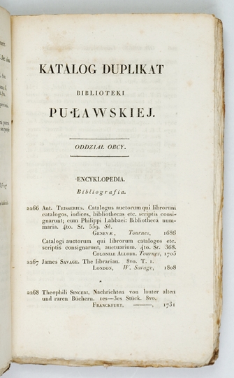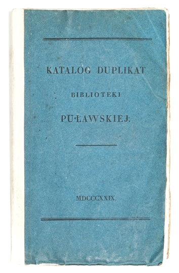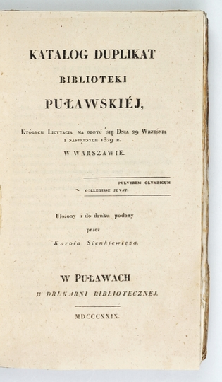 SIENKIEWICZ Karol – Katalog duplikat biblioteki puławskiej, których licytacia ma odbyć się dnia 29 września i następnych 1829 r. w Warszawie. Ułożony i do druku podany przez ... Puławy 1829. Druk. Biblioteczna. 8, s. XVII, [3], 340, tabl. 1. brosz.