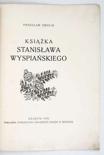 SMOLIK Przecław – Książka Stanisława Wyspiańskiego. Kraków 1932. Tow. Miłośników Książki. 4, s. 7, [3]. brosz.