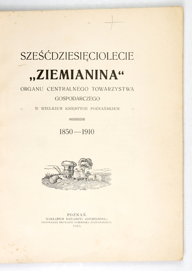 SZEŚĆDZIESIĘCIOLECIE "Ziemianina" organu Centralnego Towarzystwa Gospodarczego w Wielkiem Księstwie Poznańskiem. 1850-1910. Poznań 1910. Red. "Ziemianina". 4, s. [8], 78, [32]. brosz.